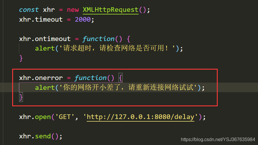 现在来看看网络异常我们需要怎么处理,那么网络异常在前端js里面也是有回调函数的,如下
