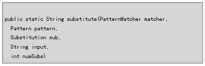 例如,有字符串fatcatfatcatfat,假设既有正则表达式模式为"cat",第一次匹配后调用appendReplacement(sb,"dog"),那么这时StringBuffer sb的内容为fatdog,也就是fatcat中的cat被替换为dog并且与匹配子串前的内容加到sb里,而第二次匹配后调用appendReplacement(sb,"dog"),那么sb的内容就变为fatdogfatdog,如果最后再调用一次appendTail(sb),那么sb最终的内容将是fatdogfatdogfat。
