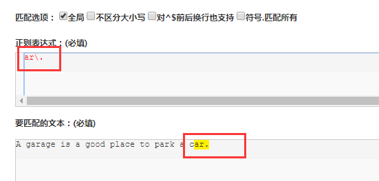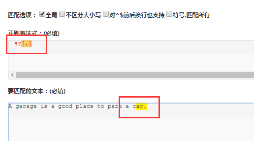 方括号的句号就表示句号. 表达式 ar[.] 匹配 ar.字符串
