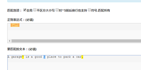 一般来说 ^ 表示一个字符串的开头,但它用在一个方括号的开头的时候,它表示这个字符集是否定的。例如,表达式[^c]ar 匹配一个后面跟着ar的除了c的任意字符。