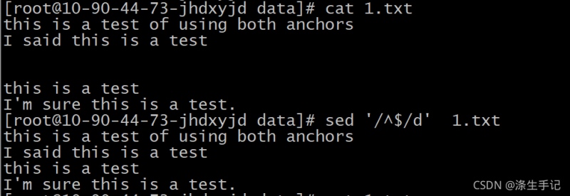定义的正则表达式模式会查找行首和行尾之间什么都没有的那些行。由于空白行在两个换行符之间没有文本,刚好匹配了正则表达式模式。sed 编辑器用删除命令 d 来删除匹配该正则表达式模式的行,因此删除了文本中的所有空白行。
