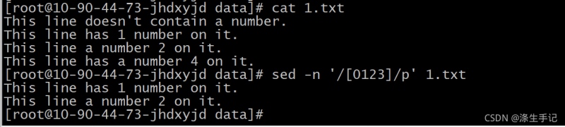 这个正则表达式模式匹配了任意含有数字 0 、 1 、 2 或 3 的行。含有其他数字以及不含有数字的 行都会被忽略掉。