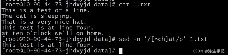 使用排除型字符组,正则表达式模式会匹配 c 或 h 之外的任何字符以及文本模式。由于空格字 符属于这个范围,它通过了模式匹配。但即使是排除,字符组仍然必须匹配一个字符,所以以 at开头的行仍然未能匹配模式。