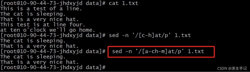 新的模式 [c-h]at 匹配了首字母在字母 c 和字母 h 之间的单词。这种情况下,只含有单词 at 的行将无法匹配该模式。