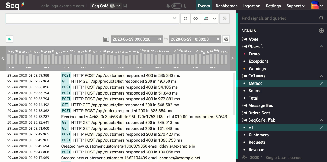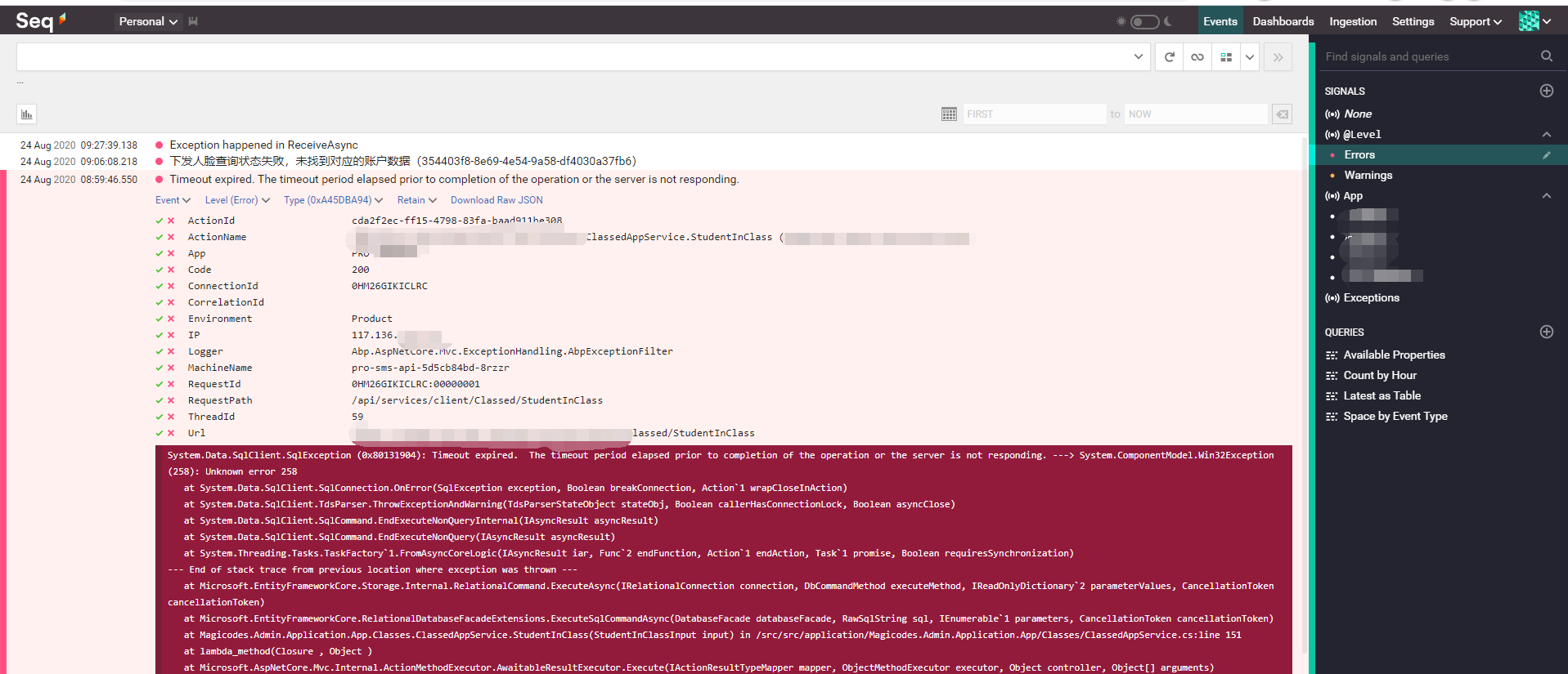 集成之后,我们就可以非常方便的在Seq的面板上看到各种日志和图表了。