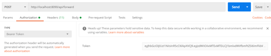 当然,如果URL(GET请求)或Body(POST请求)中包含其他参数,将其对应转发写入URL或Body即可,这里token已存储在请求头中,所以我们直接转发请求即可。接下来我们通过Postman模拟外网发出如下POST请求