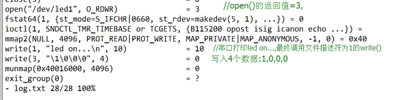 //测试led_text应用程序,打开led1,并将跟踪信息输出到log.txt中