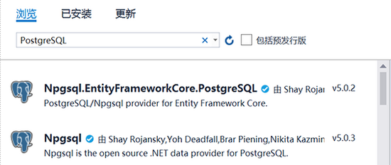 在 Visual Studio 中,项目上右键 -> 管理 NuGet 程序包。搜索 PostgreSQL。