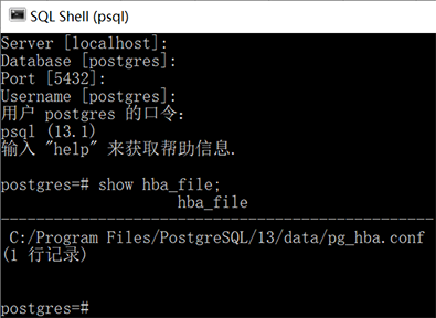 当然,因版本不同,这个文件可能位于不同的目录,可通过SQL Shell 输入 show hba_file; 查看: