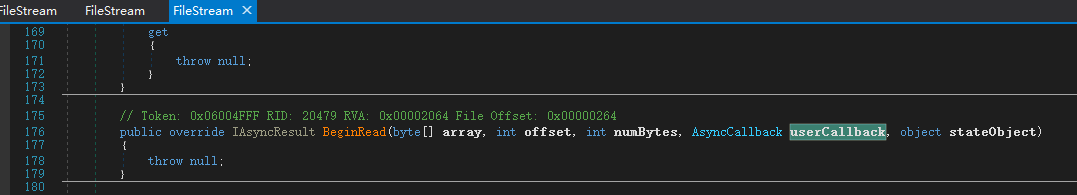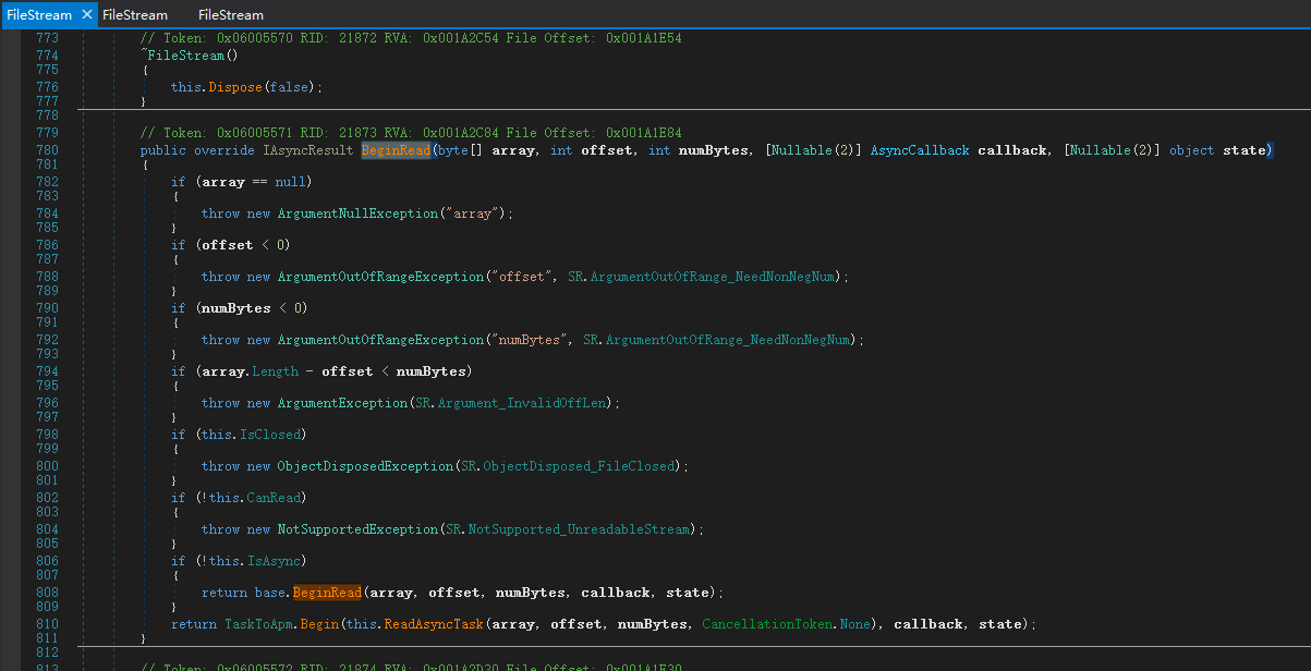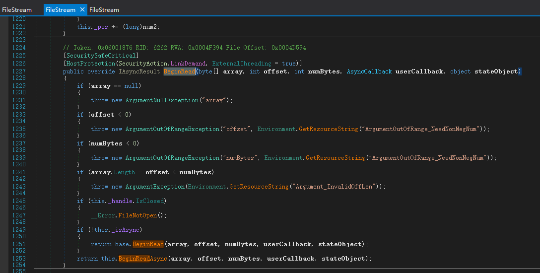 我们将三个dll 用dnspy反编译下,找到FileStream,随便找一个BeginRead方法看下代码。
