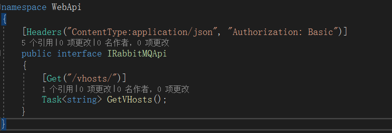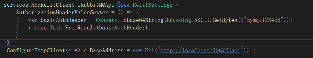 AddRefitClient方法需要添加Refit.HttpClientFactory包。通过AuthorizationHeaderValueGetter增加RabbitMQ HTTP API调用的身份认证,对应IRabbitMQApi的Headers("Authorization: Basic")部分