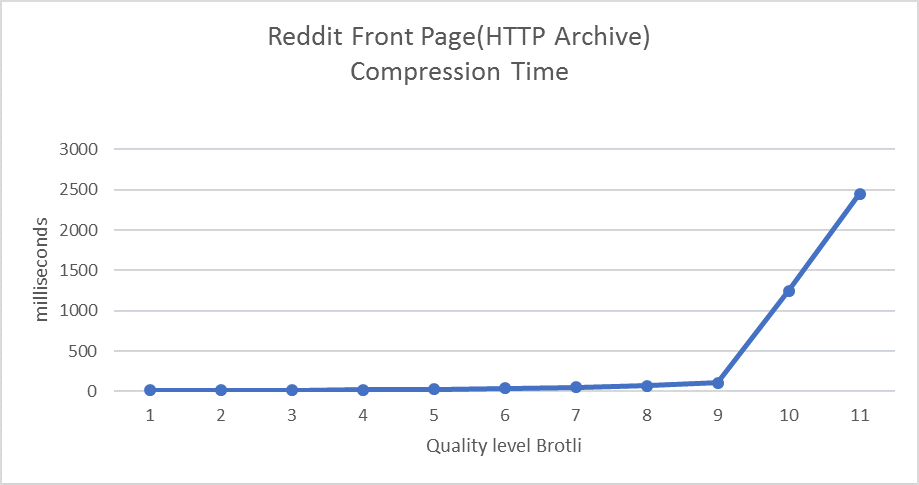 在 Introducing Support for Brotli Compression 这篇文章中,作者对不同级别 Brotil 的压缩耗时做了评测,也就是下面这幅图。