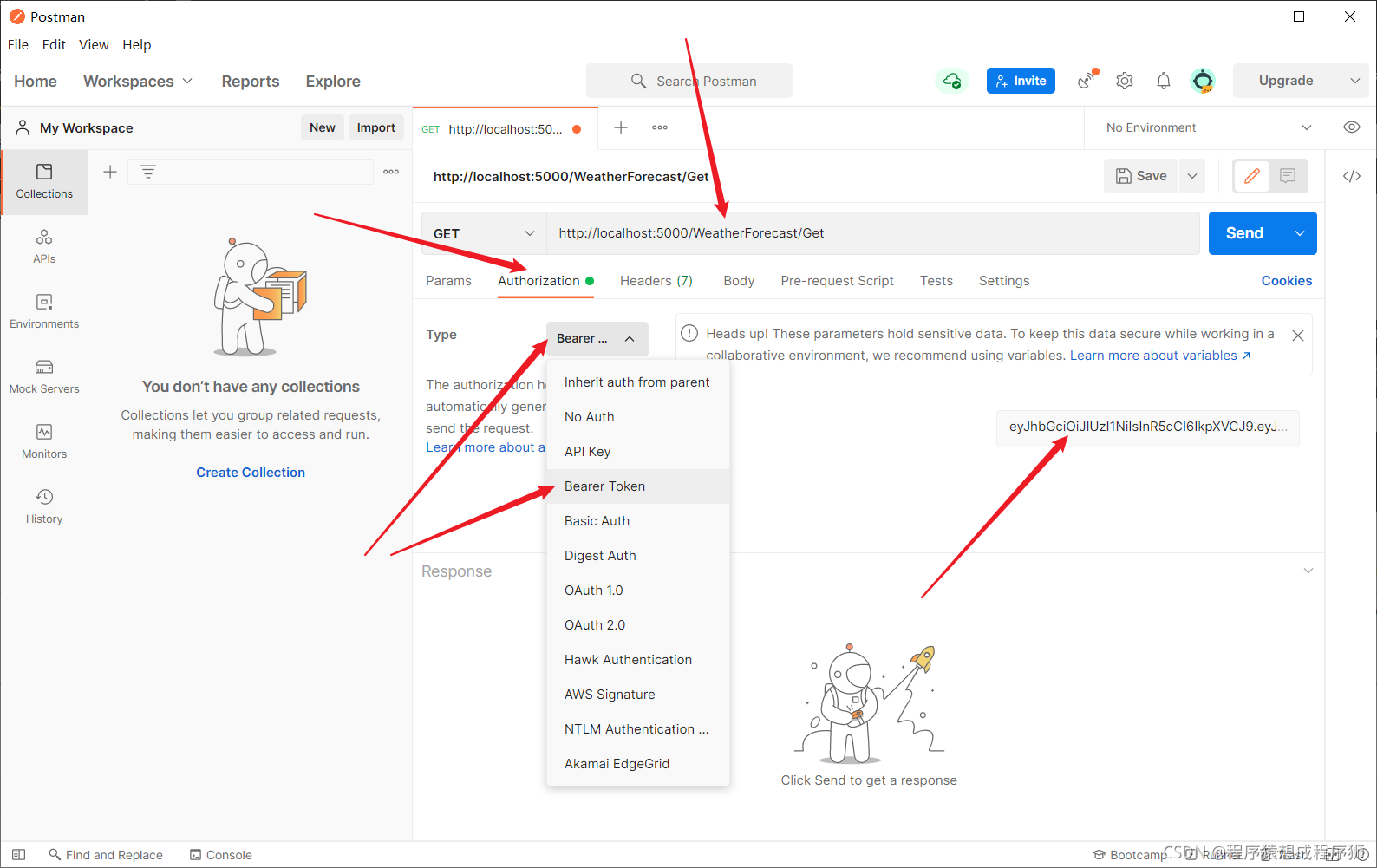 将Authorization类型设置为Bearer Token,之后将生成的token粘贴到右边