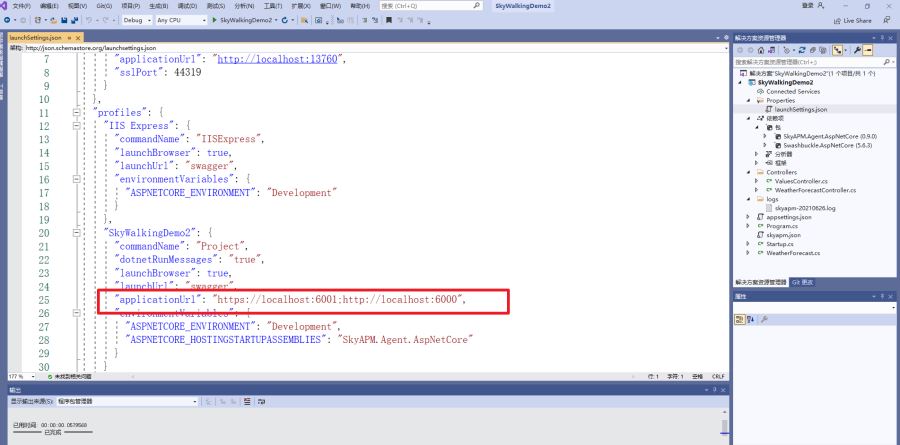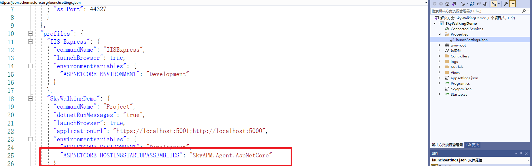 里面加上一行 "ASPNETCORE_HOSTINGSTARTUPASSEMBLIES": "SkyAPM.Agent.AspNetCore",如果用的iis express启动一样需要加到iis express配置下面。如下: