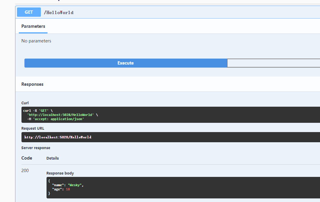 6、执行HelloWorld这个Get方法的执行结果,如下图所示。