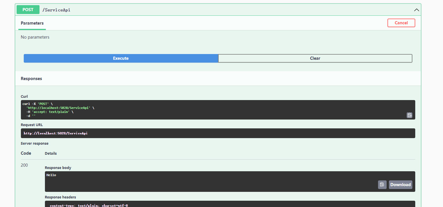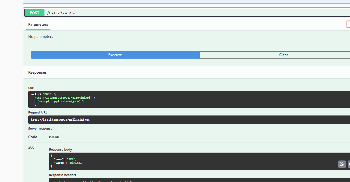 7、执行HelloMiniApi这个Post方法的执行结果,如下图所示。