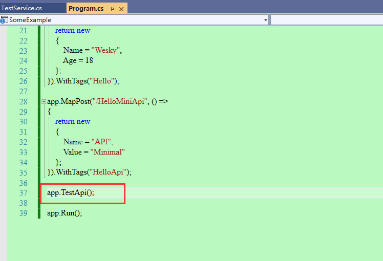 9、对api方法进行分代码文件管理。如果API方法很多,全写在program里面也不现实。所以下面做个拓展。新建用于测试使用的静态类TestService,并且实现一个静态方法TestApi。其中,方法的参数必须是thisWebApplication。然后就可以通过传入的参数,来拓展实现webapi,例如此处新增一个ServiceApi的api方法,以及有关其他实现,如下图所示。