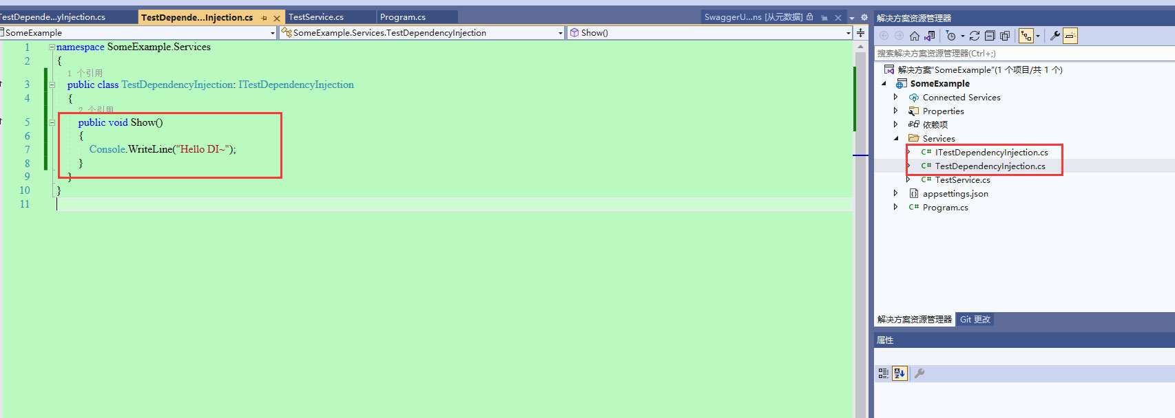 15、接下来是依赖注入的验证测试。新增一个测试服务类TestDependencyInjection,具体实现内容如图所示。