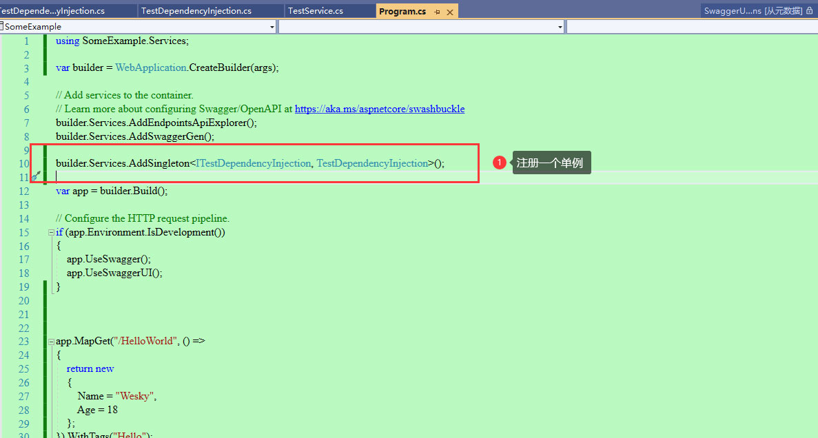17、在program文件里面,对上面的服务进行注册。此处注册一个单例实例,具体代码如下图展示。