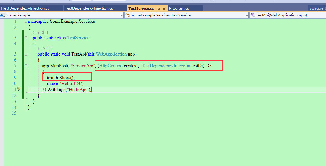 18、接下来是验证依赖注入是否成功。此处我在ServiceApi这个webapi方法里面进行注入。注入需要注意事项:在webapi方法的委托类型的参数里面,第一个参数必须是HttpContext;然后后面是自己的参数,此处是注入服务的接口。并且在api方法里面调用了show方法进行验证。