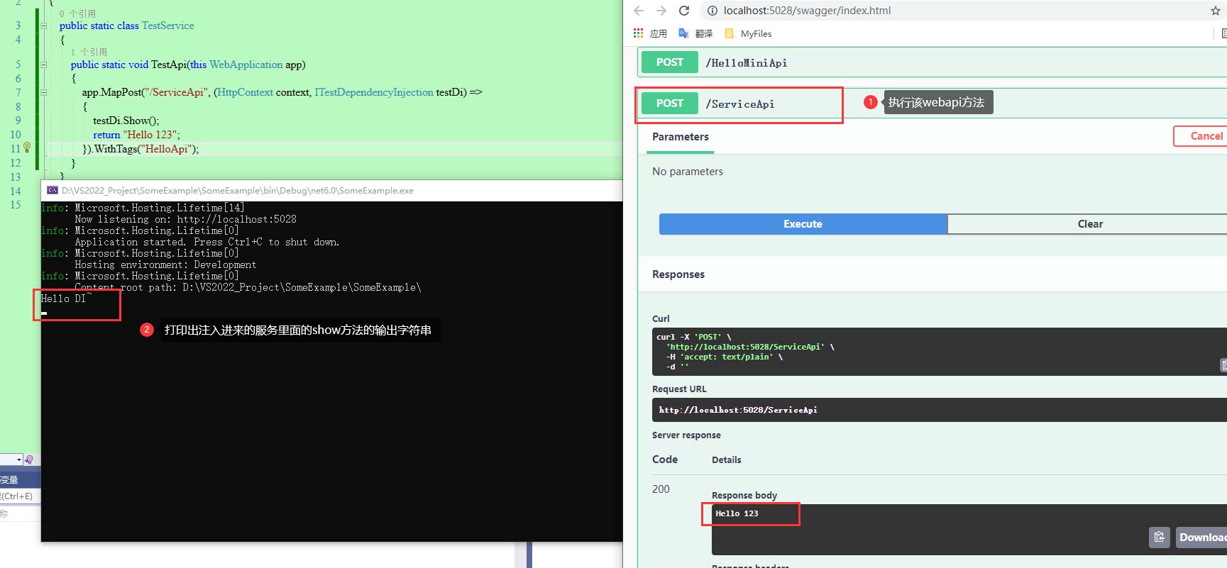 19、运行程序,在swagger展示页面点击执行对应的webapi方法,并查看结果。如下图所示,输出show方法里面的内容,代表依赖注入成功。