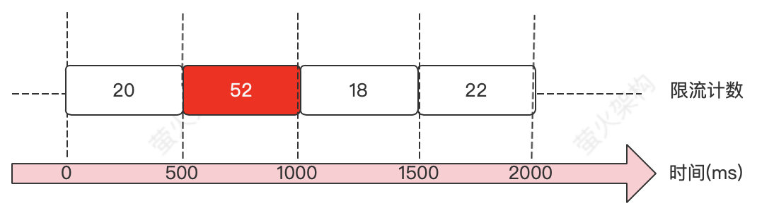 - 随着时间的前进,滑动窗口包含的小计数周期会以500ms为单位向前移动,但始终是包含2个小计数周期。