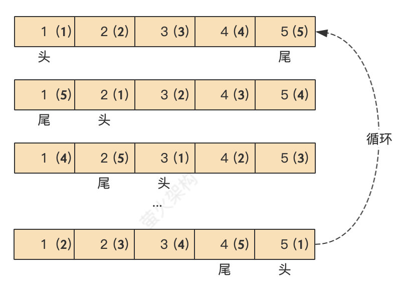 - 我们知道队列有头有尾,从队头取出数据,向队尾插入数据,带括号的数字表示是队列中的第几个元素。