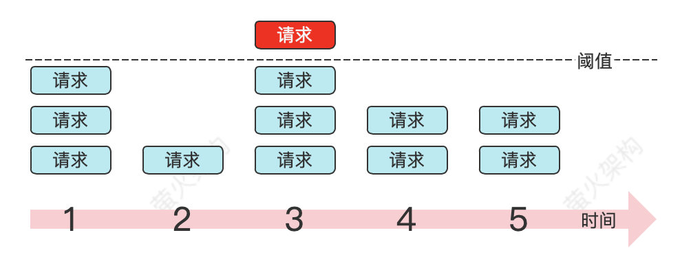 - 第1秒3个请求,不会触发限流;
