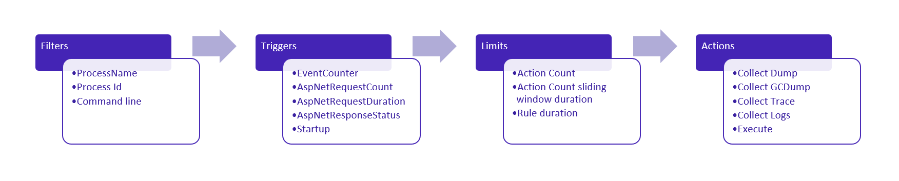 dotnet monitor 可以配置为根据发现的进程中的条件自动收集诊断信息。 发现新进程时,如果该进程数据与规则匹配,则 dotnet monitor 将尝试应用配置的规则。 应用的规则将开始监视触发器描述的条件的过程。 如果满足该条件,则假定尚未达到指定的限制来执行操作列表。