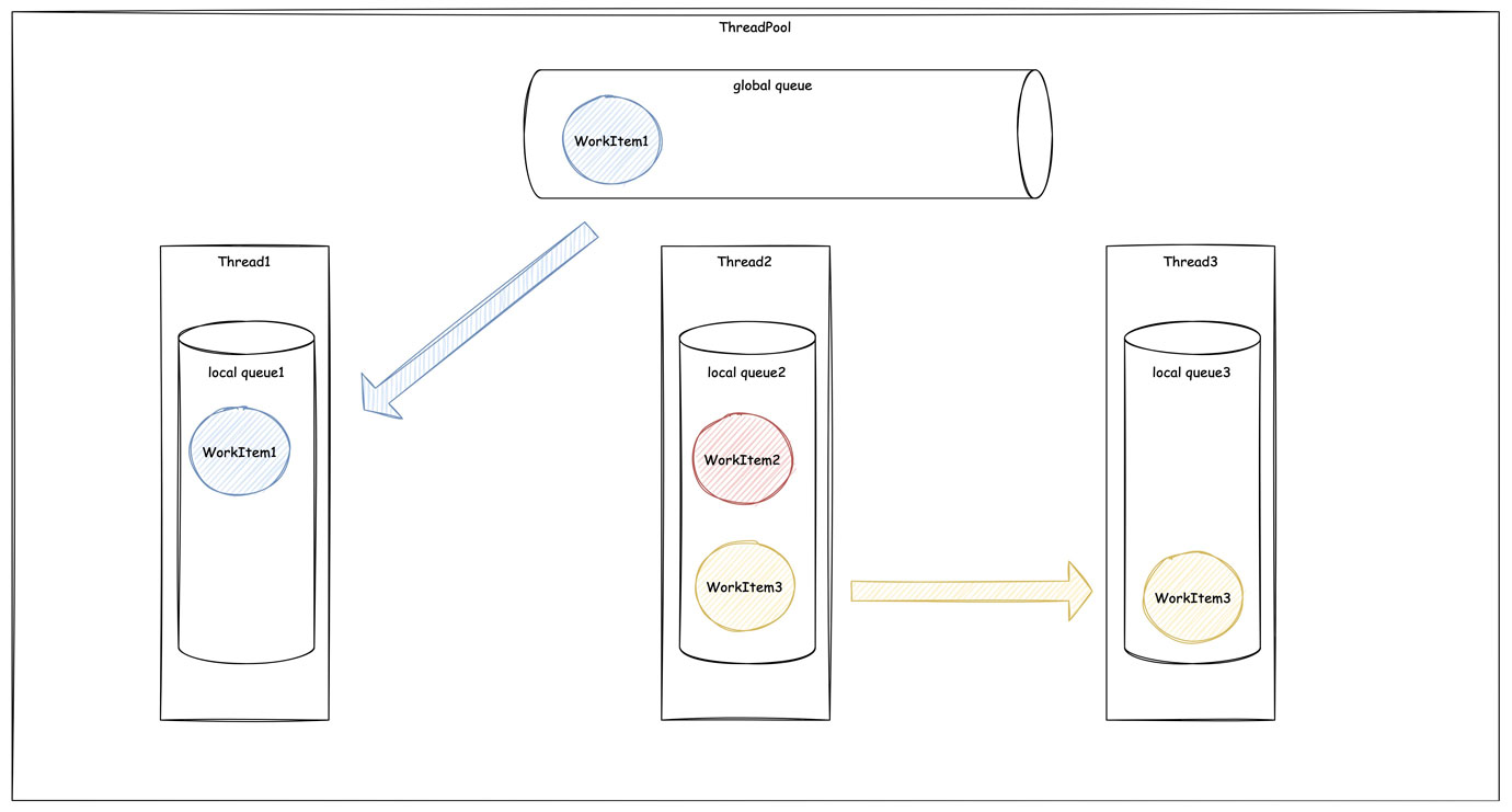 Worker Thread 的 while(true) 中优先会从自身的 WorkStealingQueue 中取任务。如果本地队列已经被清空,就会从全局队列中取任务。例如下图的 Thread1 取全局队列中领取了一个任务。