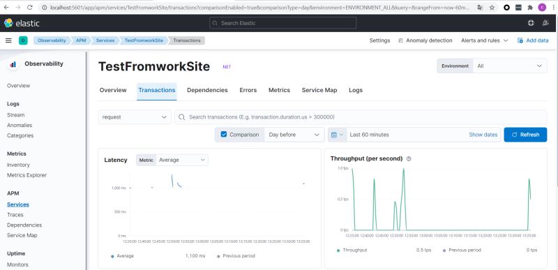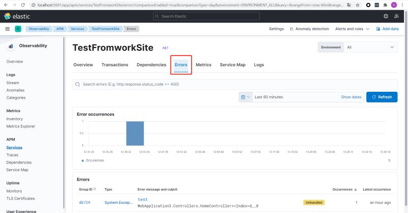 直接启动网站即可在Kibana中看到对应的Service:TestFromworkSite
