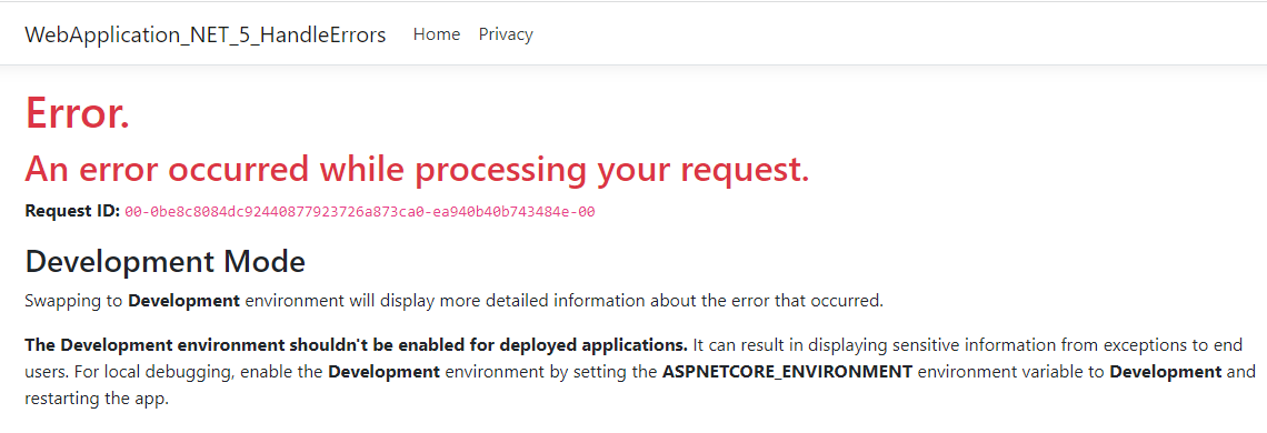 可以看到,当程序运行在开发环境中时,才会启用开发人员异常页,这很好理解,因为在生产环境中,我们不能将异常的详细信息暴露给用户,否则,这将会导致一系列安全问题。