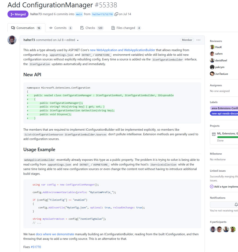 翻译:这添加了 ASP.NET Core 的新 WebApplcation 和 WebApplicationBuilder已经使用的类型,允许从配置(例如appsettings.json和DOTNET_/ASPNETCORE_环境变量)中读取,同时仍然能够添加新的配置源,而无需显式重建配置。每次通过IConfigurationBuilder界面添加源时IConfiguration,都会立即自动更新。