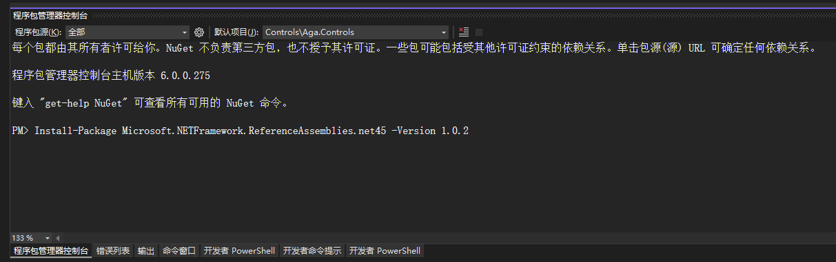 将PM:后的代码复制进程序包控制台并回车(VS顶部菜单栏 -> 视图 -> 其他 -> 程序包控制台)