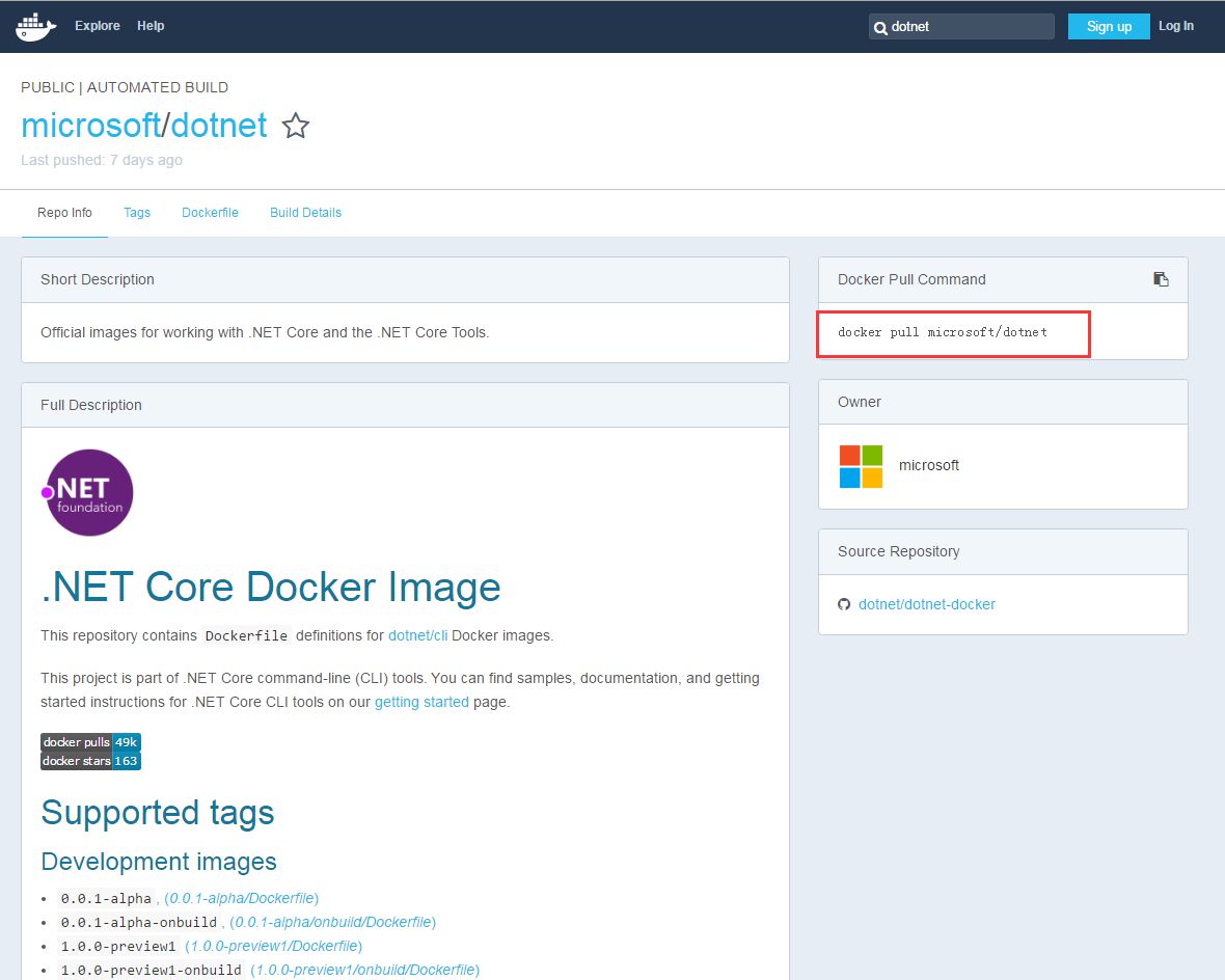打开 https://hub.docker.com 右上角搜索dotnet,选择第一个搜索结果microsoft/dotnet,点进去如下图: