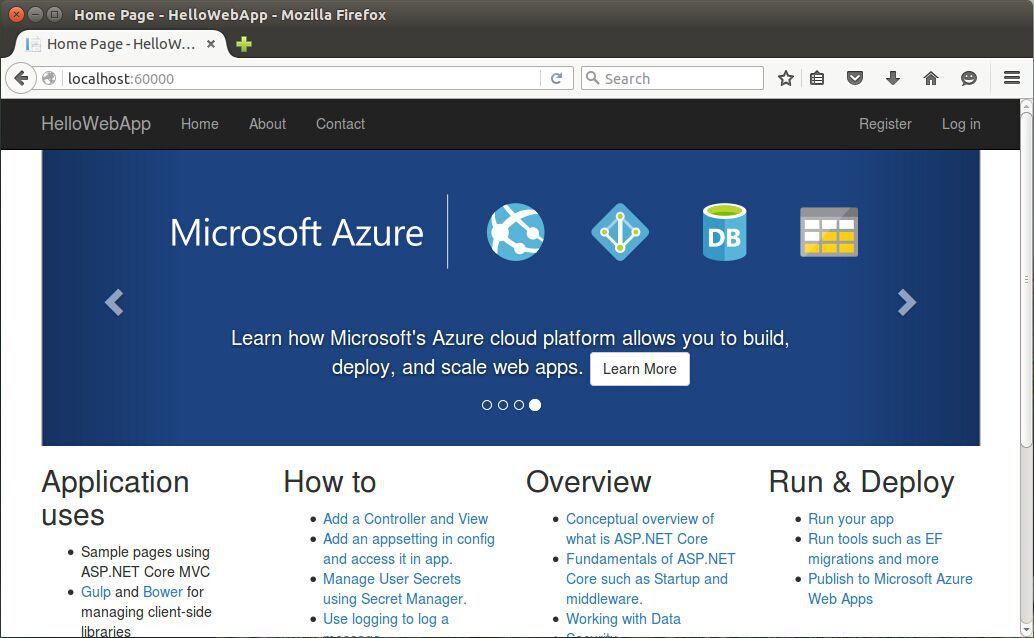 #基于 `microsoft/dotnet:1.0.0-core` 来构建我们的镜像 FROM microsoft/dotnet:1.0.0-core #拷贝项目publish文件夹中的所有文件到 docker容器中的publish文件夹中 COPY . /publish #设置工作目录为 `/publish` 文件夹,即容器启动默认的文件夹 WORKDIR /publish #设置Docker容器对外暴露60000端口 EXPOSE 60000 #使用`dotnet HelloWebApp.dll`来运行应用程序 CMD ["dotnet", "HelloWebApp.dll", "--server.urls", "http://*:60000"]