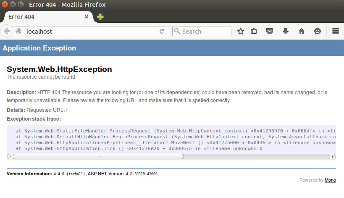 打开浏览器输入http://localhost 如果看到下面这个异常界面,代表运行成功了。
