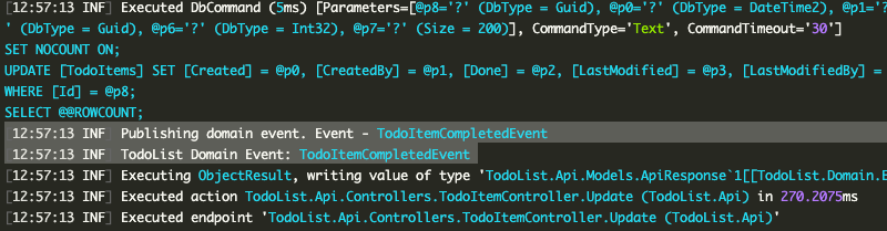 _logger.LogInformation("TodoList Domain Event: {DomainEvent}", domainEvent.GetType().Name);