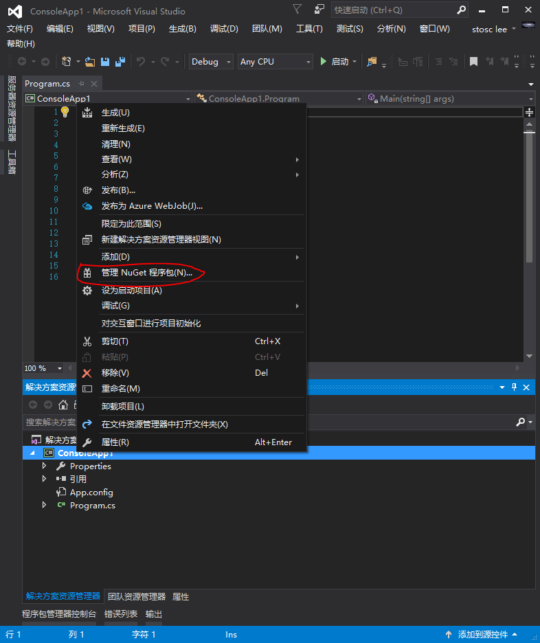 第一步:打开visual studio 2017 新建一个控制台项目,打开nuget包管理器。