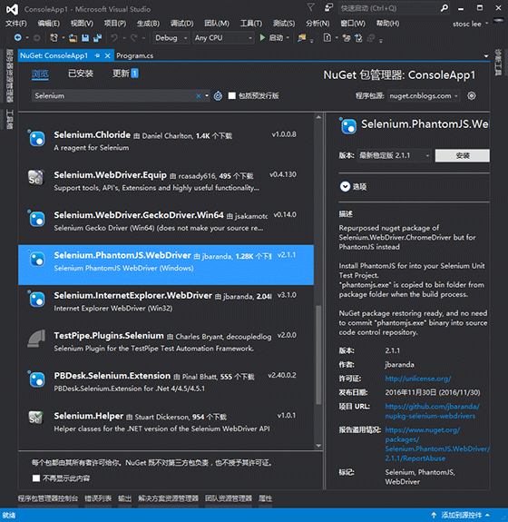 第四步:打开nuget安装Selenium.PhantomJS.WebDriver包。