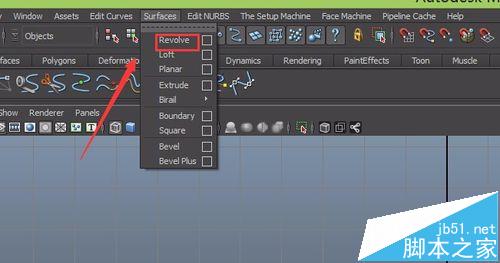 9、在surfaces菜单的下拉菜单栏里找到revolve选项,如图所示: