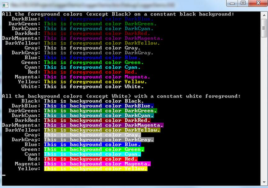 Console.WriteLine("All the foreground colors (except Black) on a constant black background:");