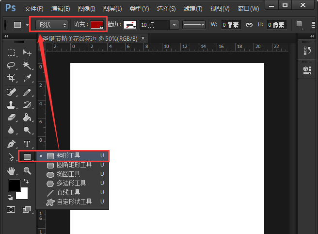 2、用矩形工具先填充上一个红色,然后在白色的画上绘画一个小长方形。