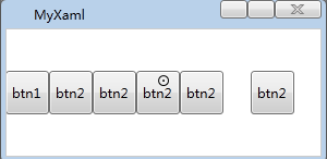 <DockPanel> <Button Name='btn1' Height='40' Width='40' Content='btn1' /> <Button Height='40' Width='40' Content='btn2' /> <Button Height='40' Width='40' Content='btn2' /> <Button Height='40' Width='40' Content='btn2' /> <Button Height='40' Width='40' Content='btn2' /> <Button Height='40' Width='40' Content='btn2' /> </DockPanel>