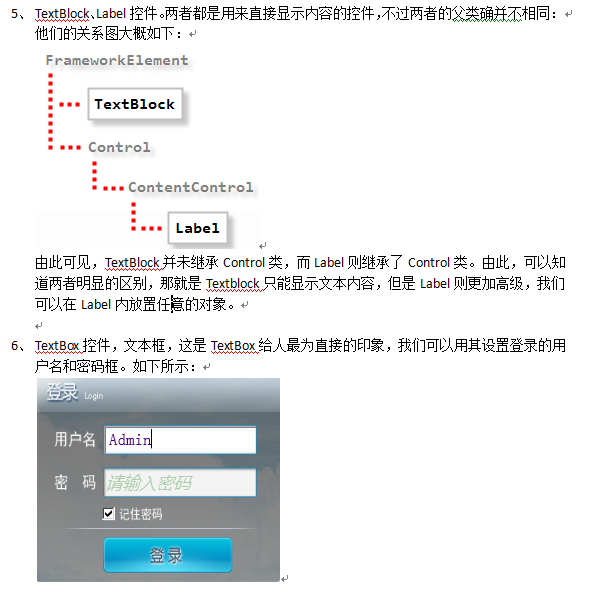 第一类:核心用户输入控件,用户创建用户界面的核心。其中比较常用的有Button、RadioButton、ComboBox、CheckBox、DataGrid、ListBox、ListView、TreeView、TextBlock、TextBox、Label。