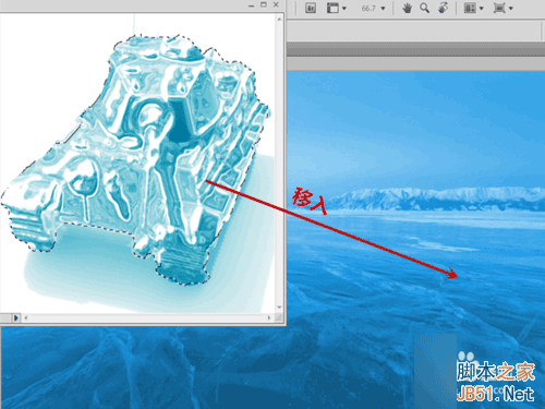 8、使用套索工具选中冰冻坦克,将其拖入冰面素材,ctrl+T调整大小,ctrl+鼠标左键调整立体感,效果如图。