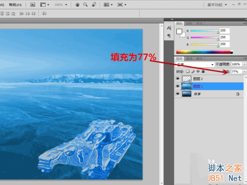 10、调整图层2“不透明度为86%”,图层1“填充为77%”,坦克冰冻效果已完成。