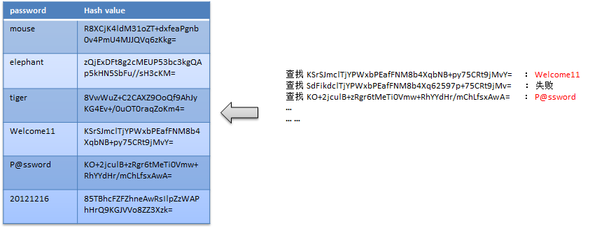 查表法不像字典破解和暴力破解那样猜密码,它首先将一些比较常用的密码的哈希值算好,然后建立一张表,当然密码越多,这张表就越大。当你知道某个密码的哈希值时,你只需要在你建立好的表中查找该哈希值,如果找到了,你就知道对应的密码了。