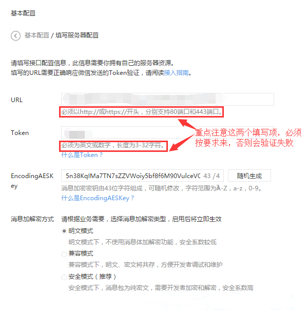 填写服务器地址(URL)、Token和EncodingAESKey,其中URL是开发者用来接收微信消息和事件的接口URL。Token可由开发者可以任意填写,用作生成签名(该Token会和接口URL中包含的Token进行比对,从而验证安全性)。EncodingAESKey由开发者手动填写或随机生成,将用作消息体加解密密钥。