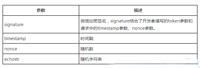 开发者提交信息后,微信服务器将发送GET请求到填写的服务器地址URL上,GET请求携带四个参数。